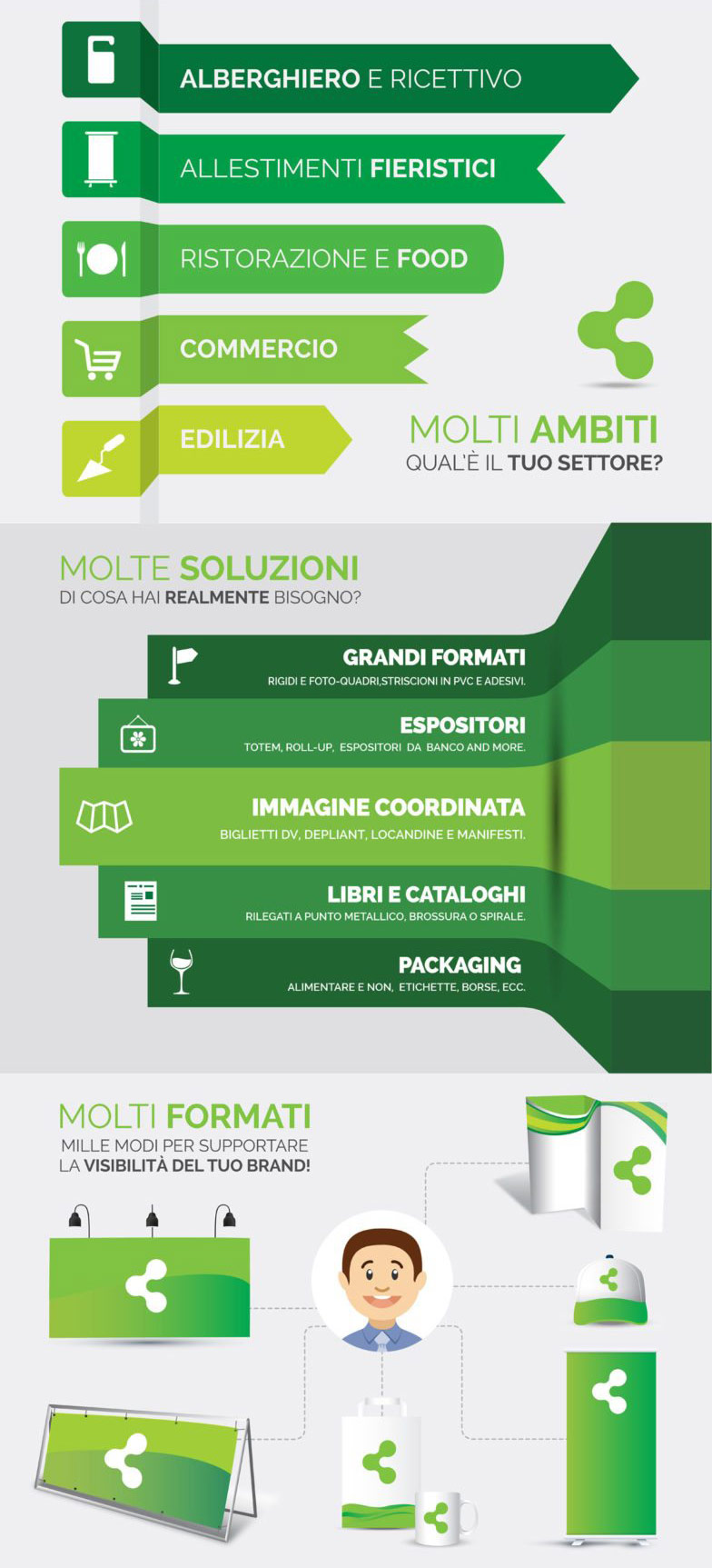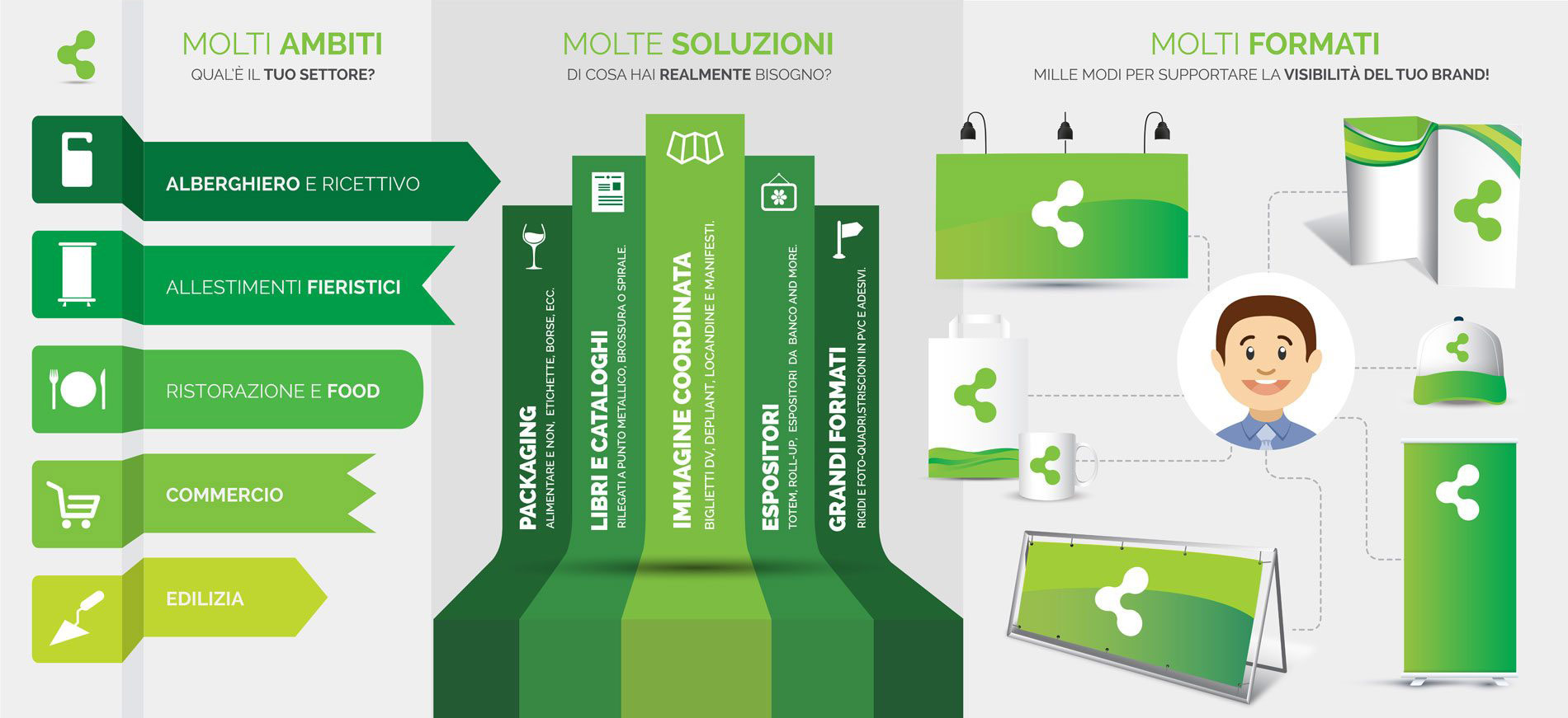 Grazie a una rete di collaborazioni con professionisti di comprovata serietà ed esperienza possiamo realizzare e fornire in tempi brevi: biglietti da visita, brochure aziendali, cataloghi cartacei, locandine, manifesti e flyer, banner, allestimenti per stand fieristici, packaging, adesivi.